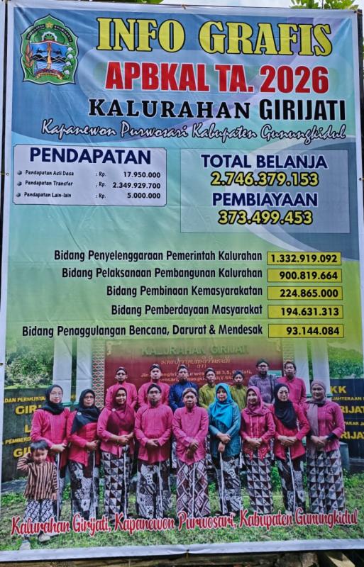 Girijati - Setelah berakhirnya Tahun Anggaran 2025, Pemerintah Kalurahan Girijati melaksanakan Laporan Pertanggungjawaban Realisasi APBKal Tahun 2025 dan melakukan publikasi Laporan Pertanggungjawaban Realisasi Penggunaan Anggaran Pendapatan dan Belanja Kalurahan (APBKal) Tahun Anggaran 2026. Kegiatan ini sebagai bentuk tertib administrasi dalam pengelolaan keuangan kalurahan.